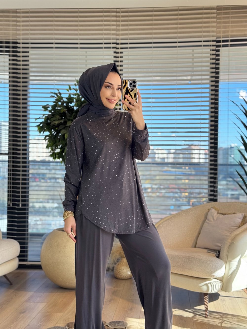 52839 Üst Taş Baskı Şalvar Pantolonlu Takım Antrasit