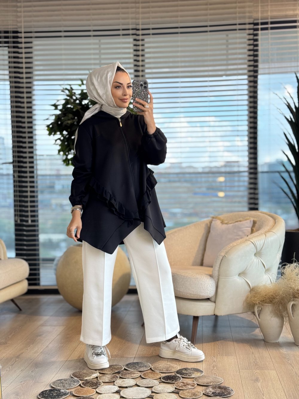 6109 Ön Arka Şifon Fırfırlı Kapşonlu Ceket Siyah