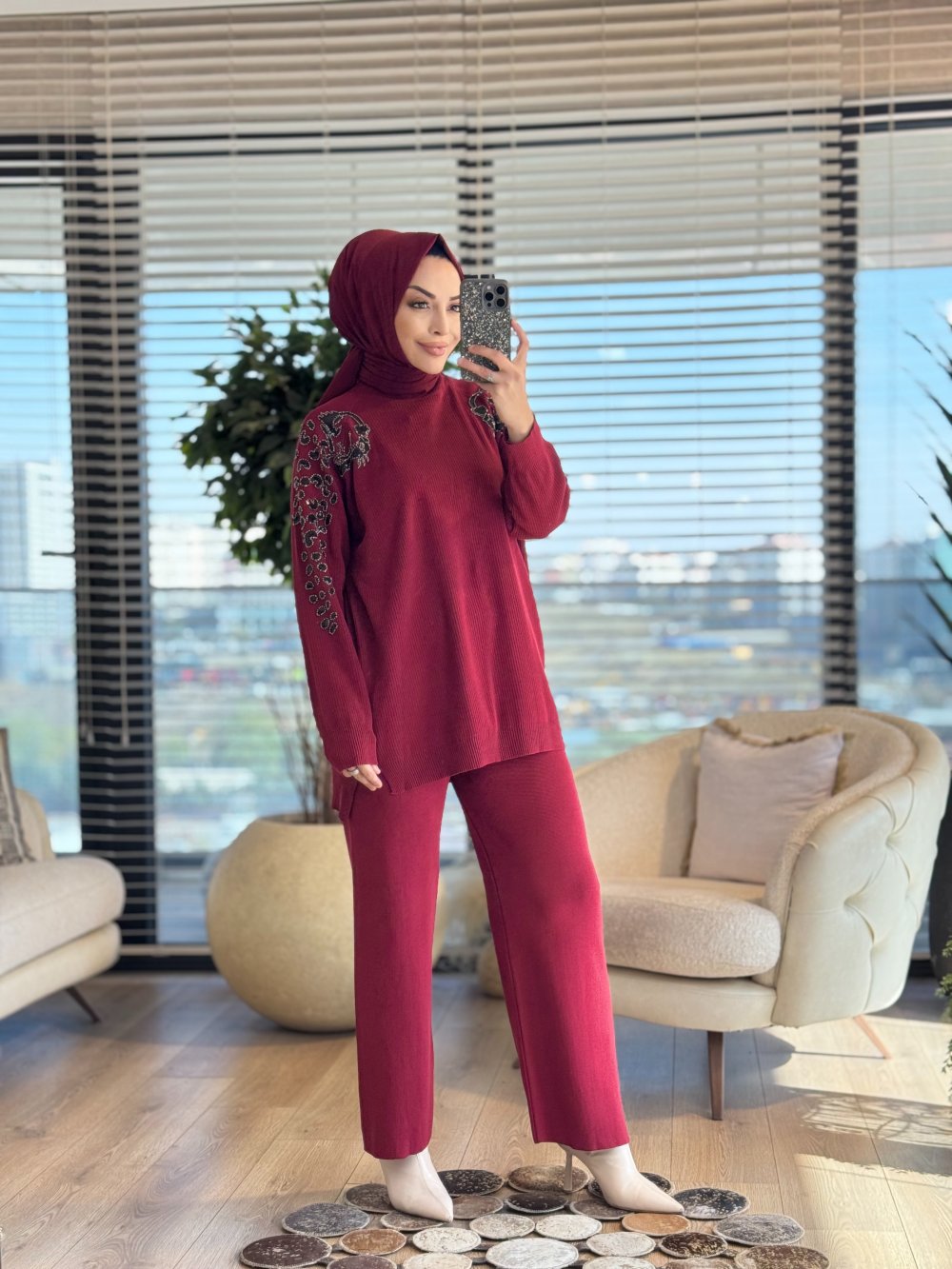 6870 Kolları İşli Triko Takım Bordo