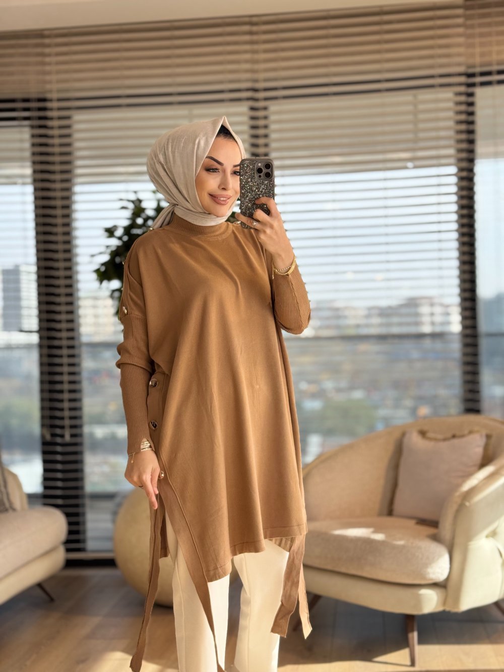 7011 Dicle Yanları Düğmeli Tunik Latte