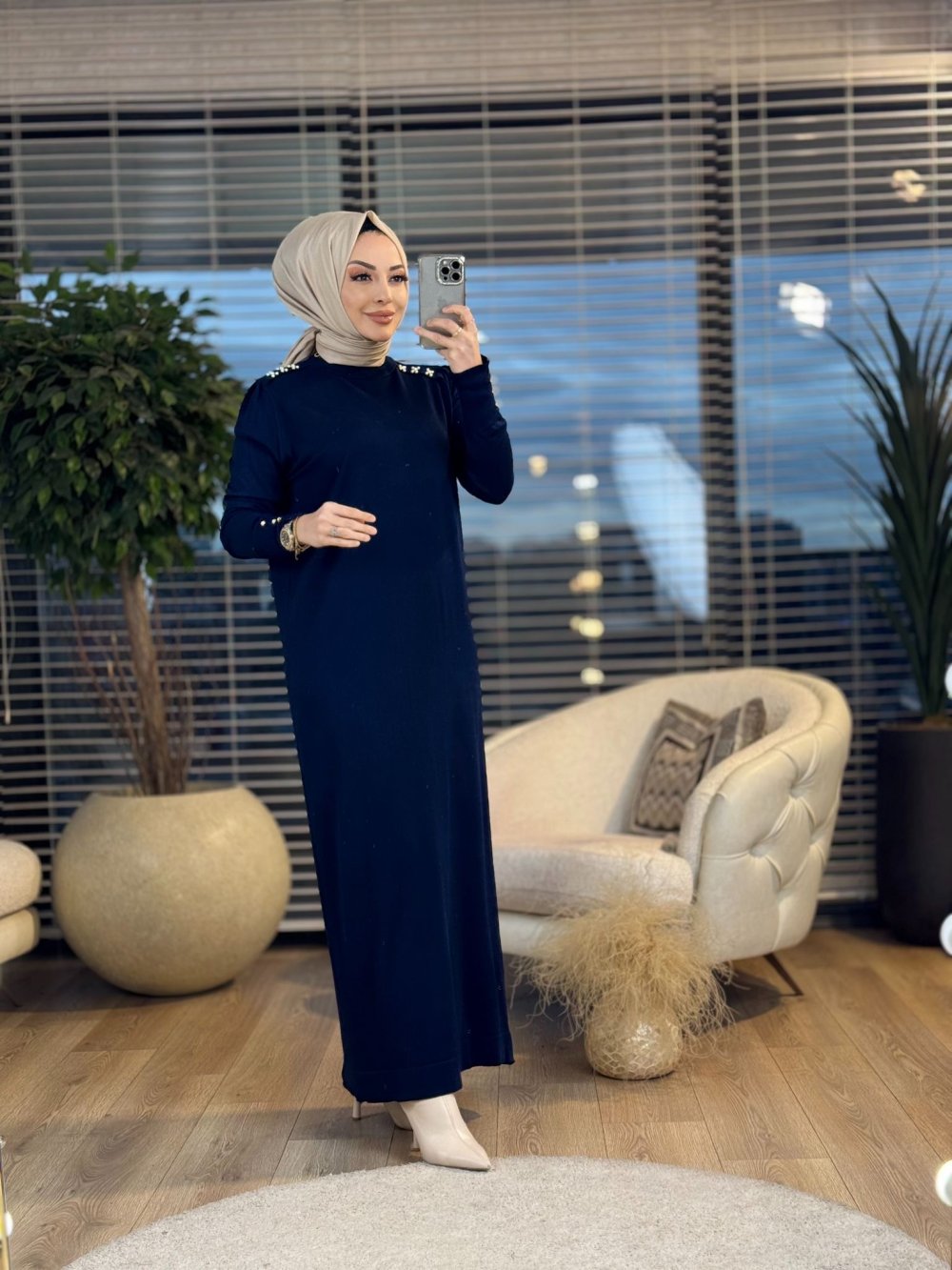 7036 Omzları İncili Vanezia Triko Elbise Lacivert