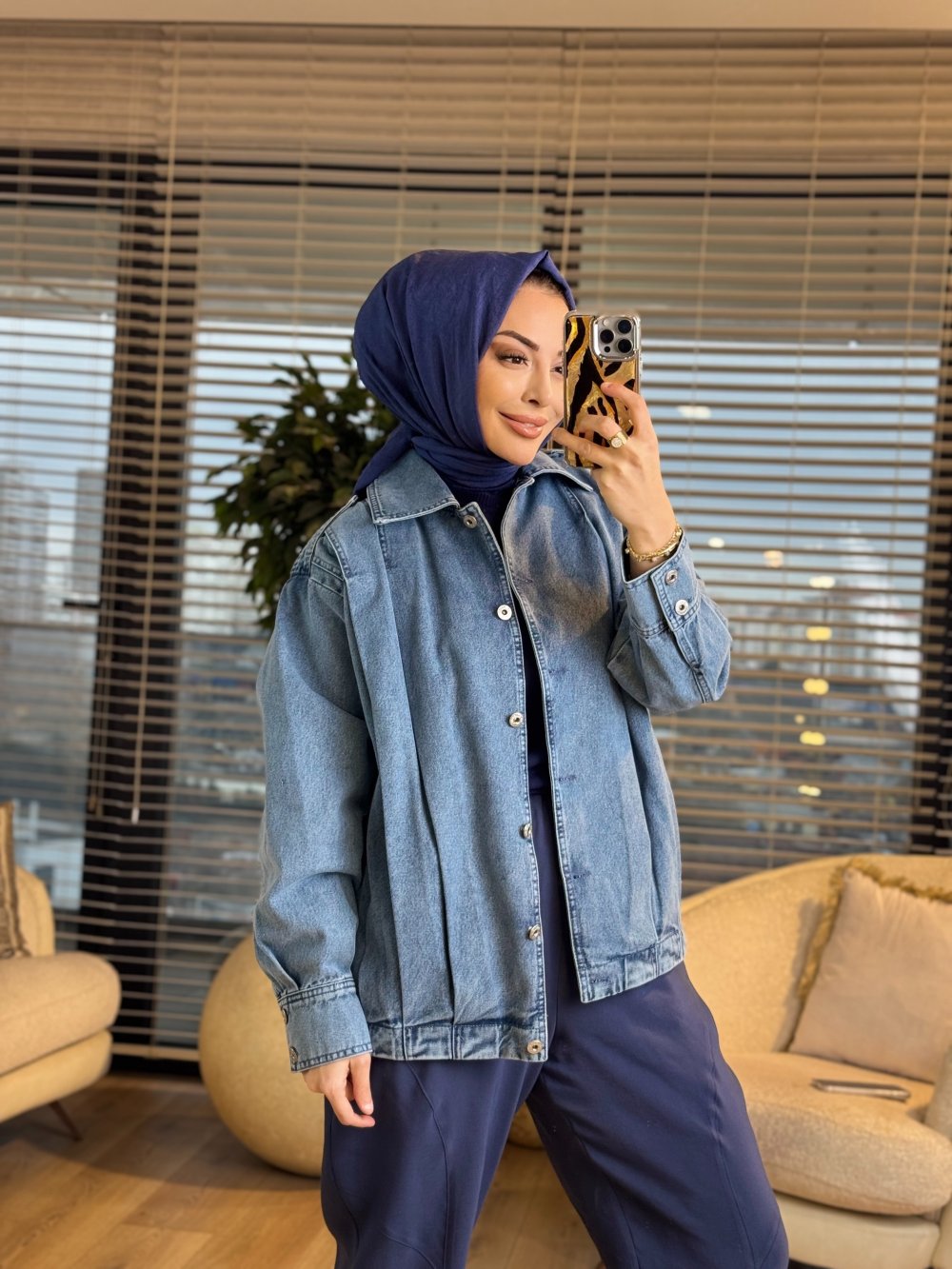 7458 Omuzları Pile Detaylı Kot Ceket Mavi