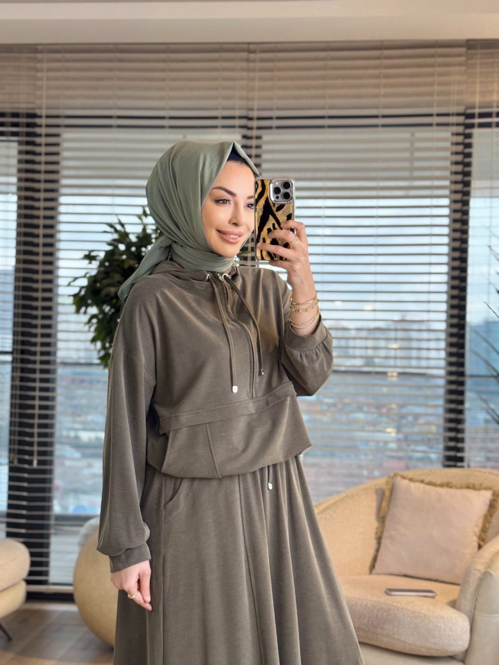7473 Patı Fermuarlı Bel Parçalı Kapşonlu Takım Haki