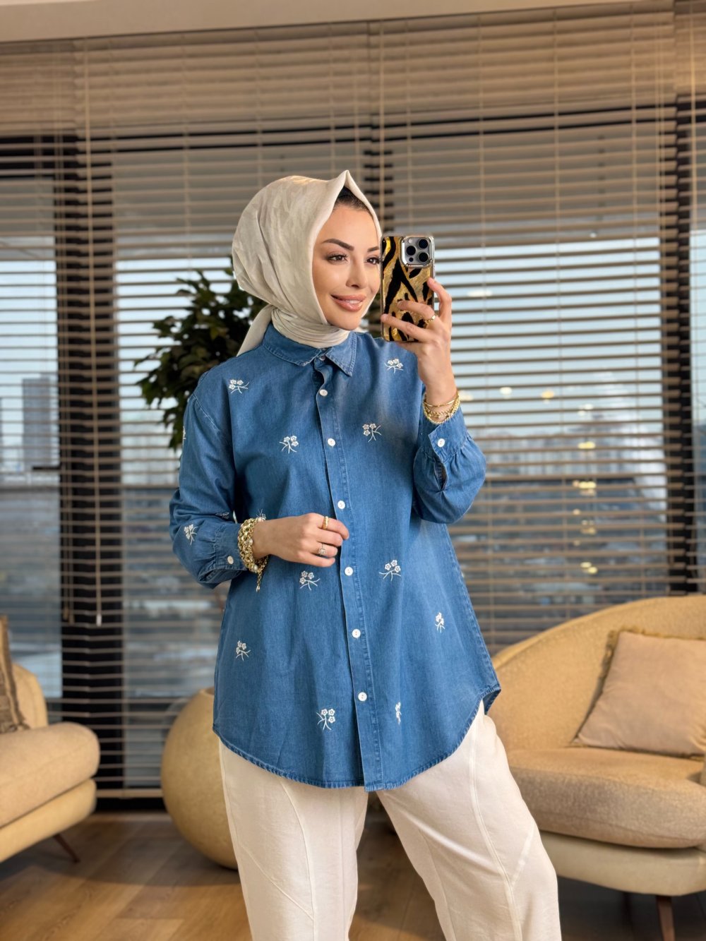 7476 Tencel Üstü Çiçek Nakışlı Gömlek Mavi