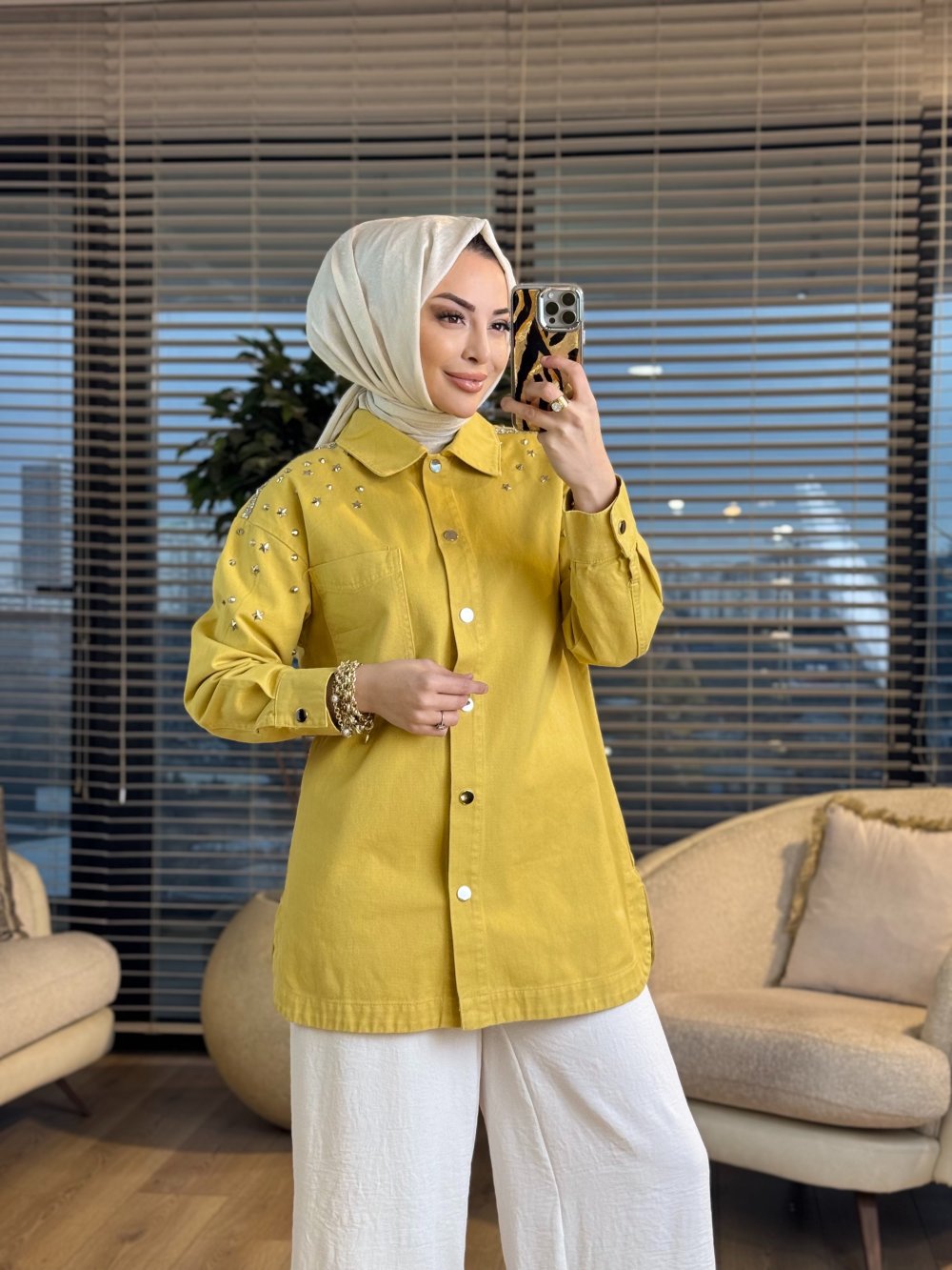 7486 Omuz Zımba Yıldız Detaylı Kot Ceket Sarı