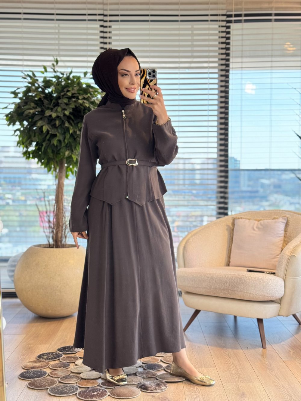 7520 Ön Fermuarlı Kemerli Etekli Takım Kahve