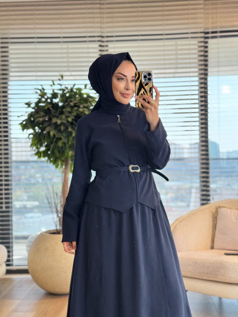 7520 Ön Fermuarlı Kemerli Etekli Takım Lacivert