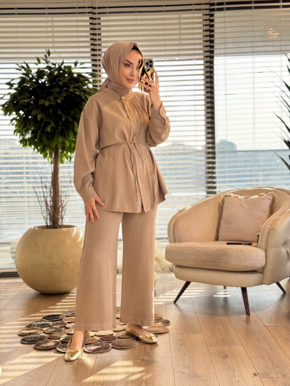 7526 Önü Pile Dikişli Yakasız Kot Takım Bej