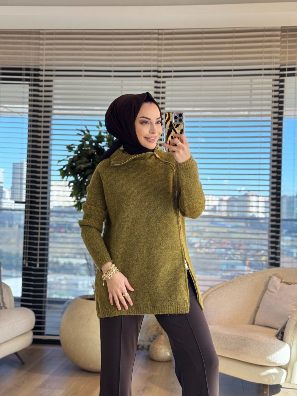 7768 Oslo Yandan Fermuarlı Triko Tunik Haki