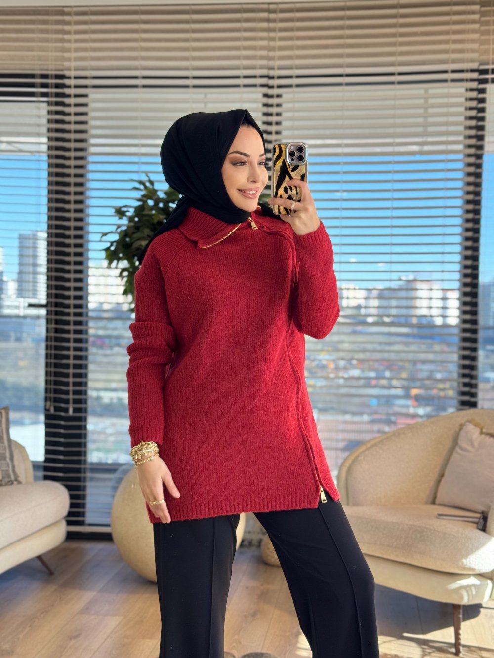 7768 Oslo Yandan Fermuarlı Triko Tunik Kırmızı