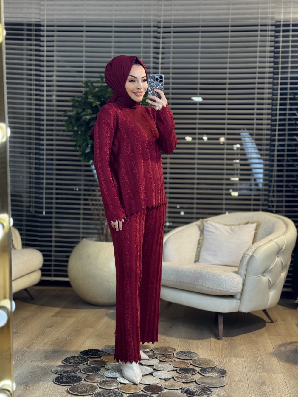 8039 Boyuna Sim Çizgili Triko Pant. Takım Bordo