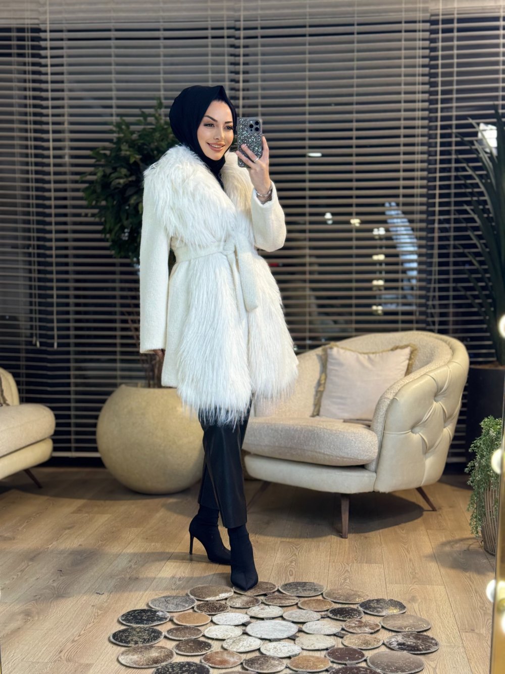 9074 Tüy Detaylı Uzun Kollu Kaban Ekru