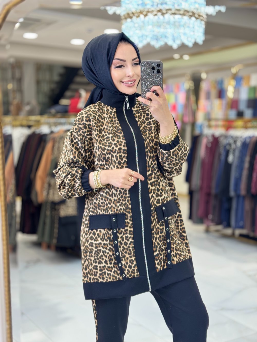 9768 Leopar Desenli Fermuarlı Takım Siyah