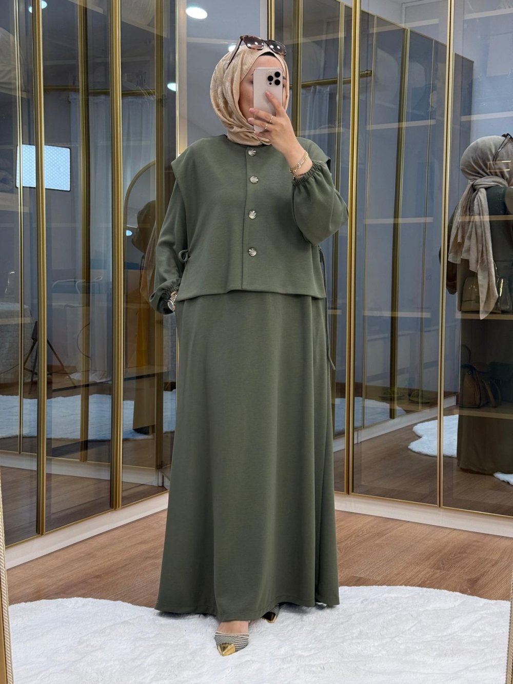 Asimetrik Düğme Detaylı Yelek Elbise Haki
