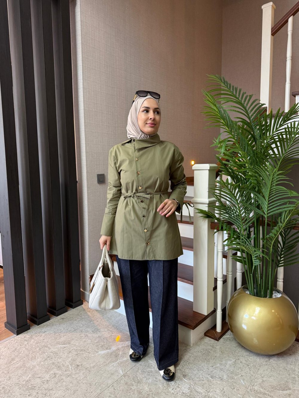 Asimetrik yakadır, gold düğme detayları bulunmaktadır. Seyyar kuşak mevcuttur.