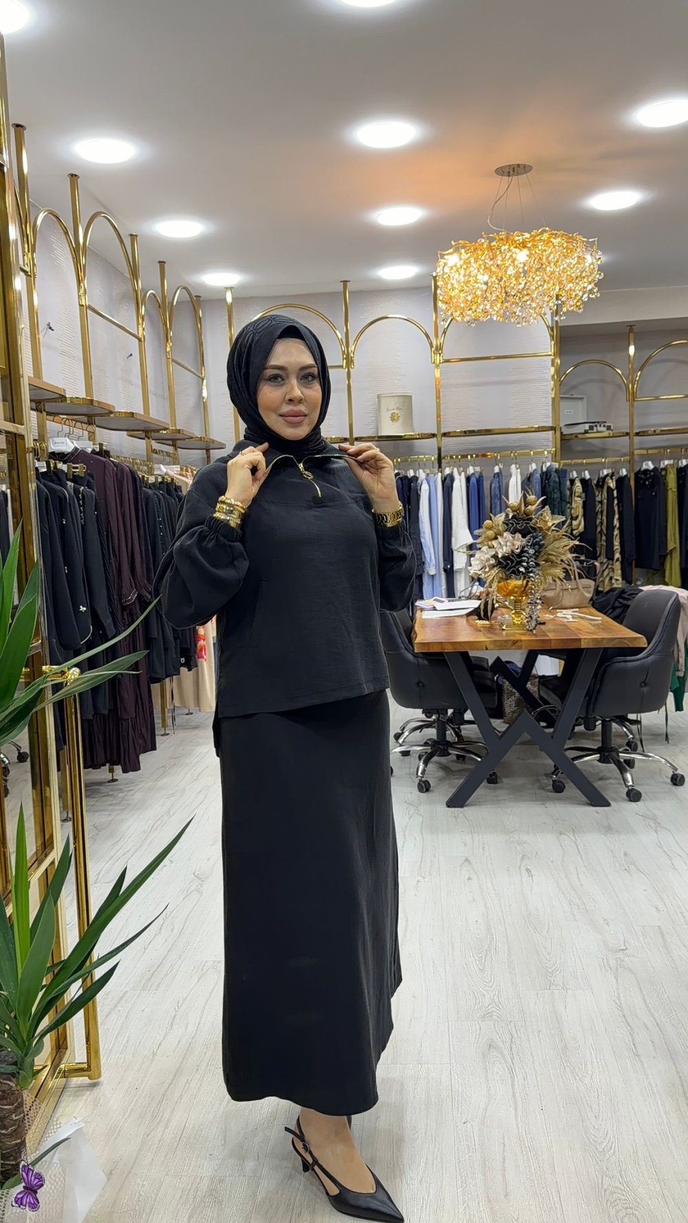Kumaşı tenseldir. Tunik önü yarım fermuarlıdır. Etek beli lastiklidir.