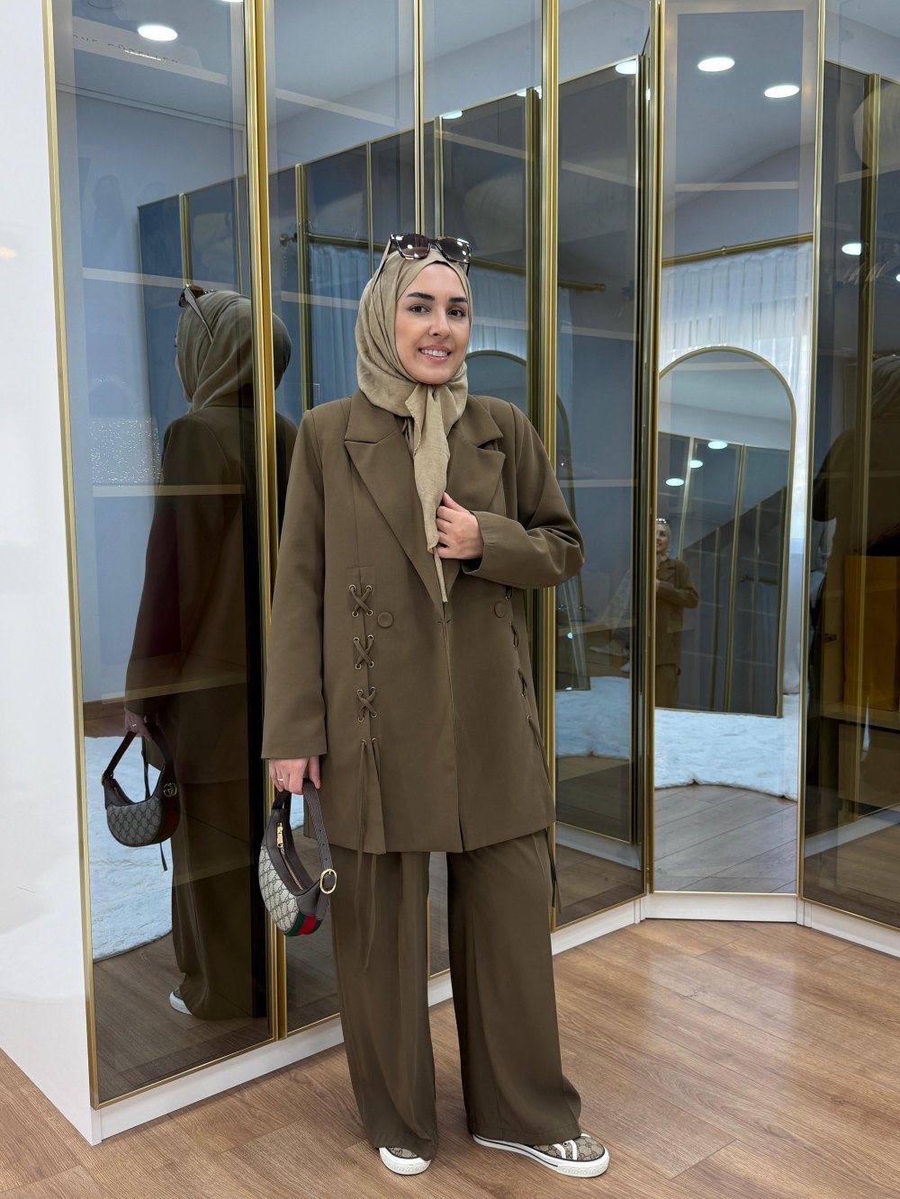 Pantolonun arka kısmı lastiklidir. Ön kısmı fermuar ve düğme detaylıdır.