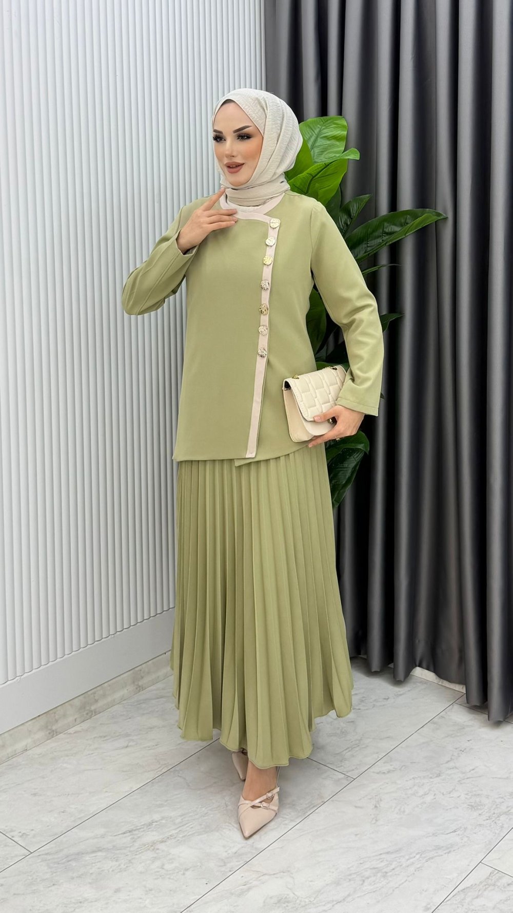 Çağla Yeşili Rabia Etek Takım Tesettür Giyim