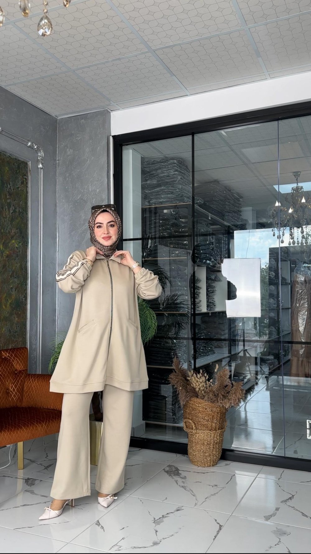 Kumaşı esnek kristal kumaştır. Pantolon beli lastiklidir. Önü hırkalıdır.