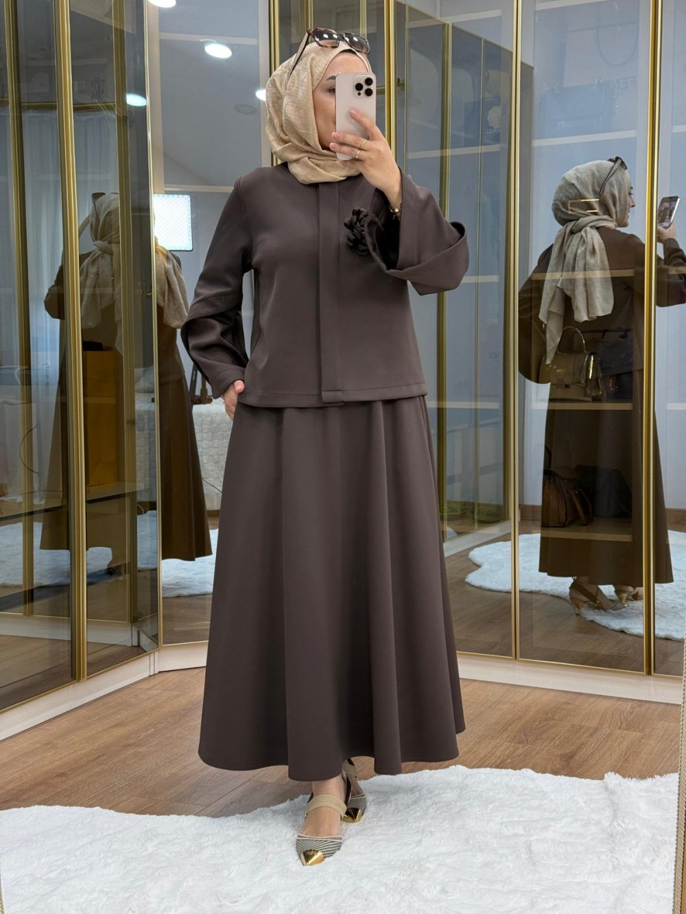 Çiçek Broş Detaylı Scuba Etekli Takım Kahverengi