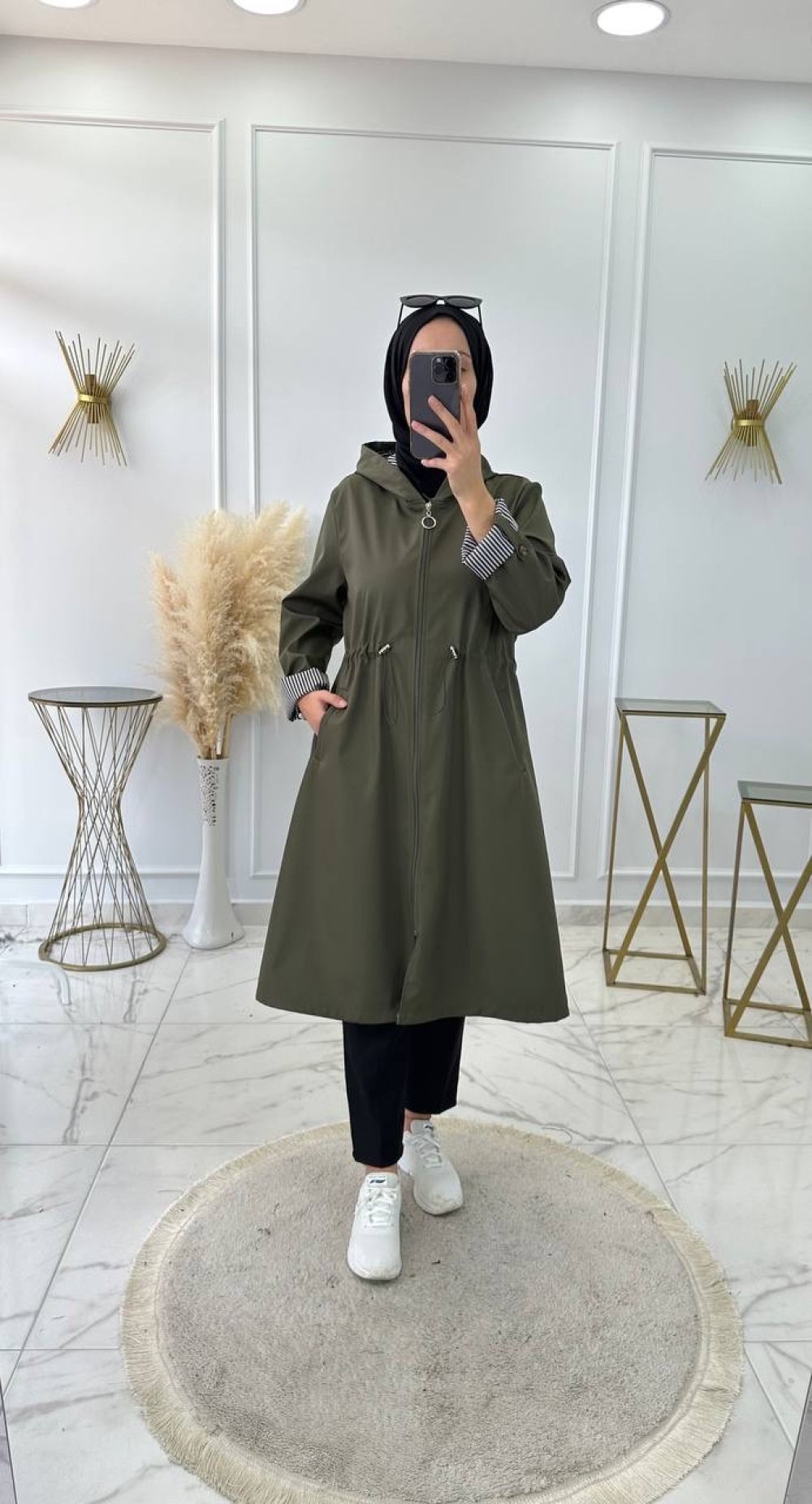 Çizgili astarlı, cepli, fermuarlı , bağcıklı, kapşonlu. Boy 105 cm