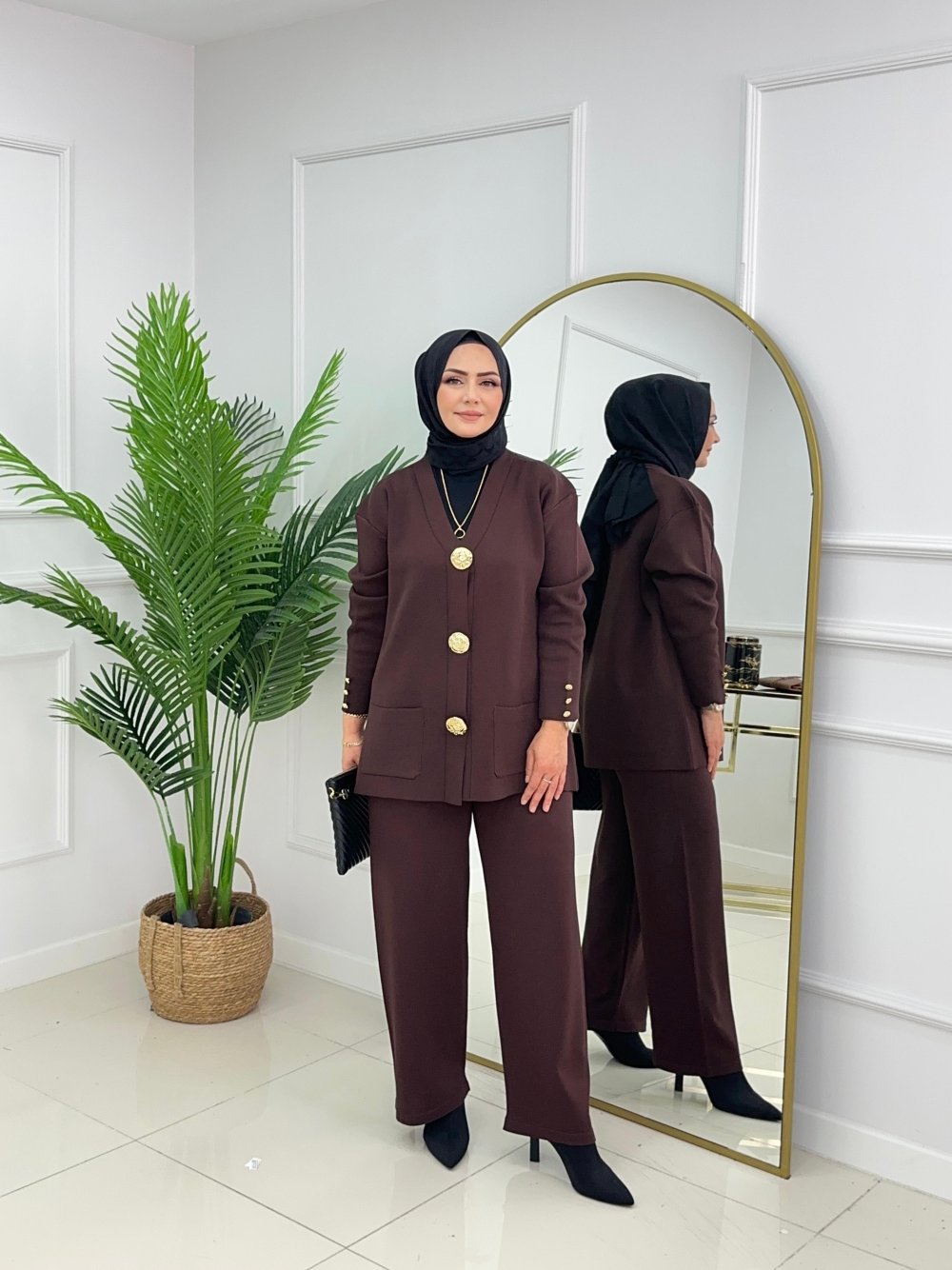 Merserize kumaşın asil duruşu, gold detayların zarafetiyle buluştu.