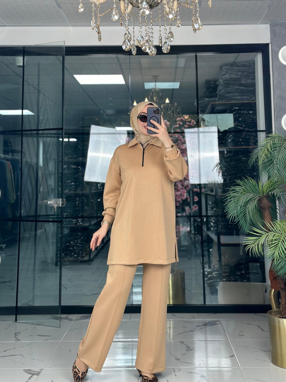 Kumaşı iki ipliktir. Tunik önü fermuarlıdır. Pantolon beli lastiklidir.