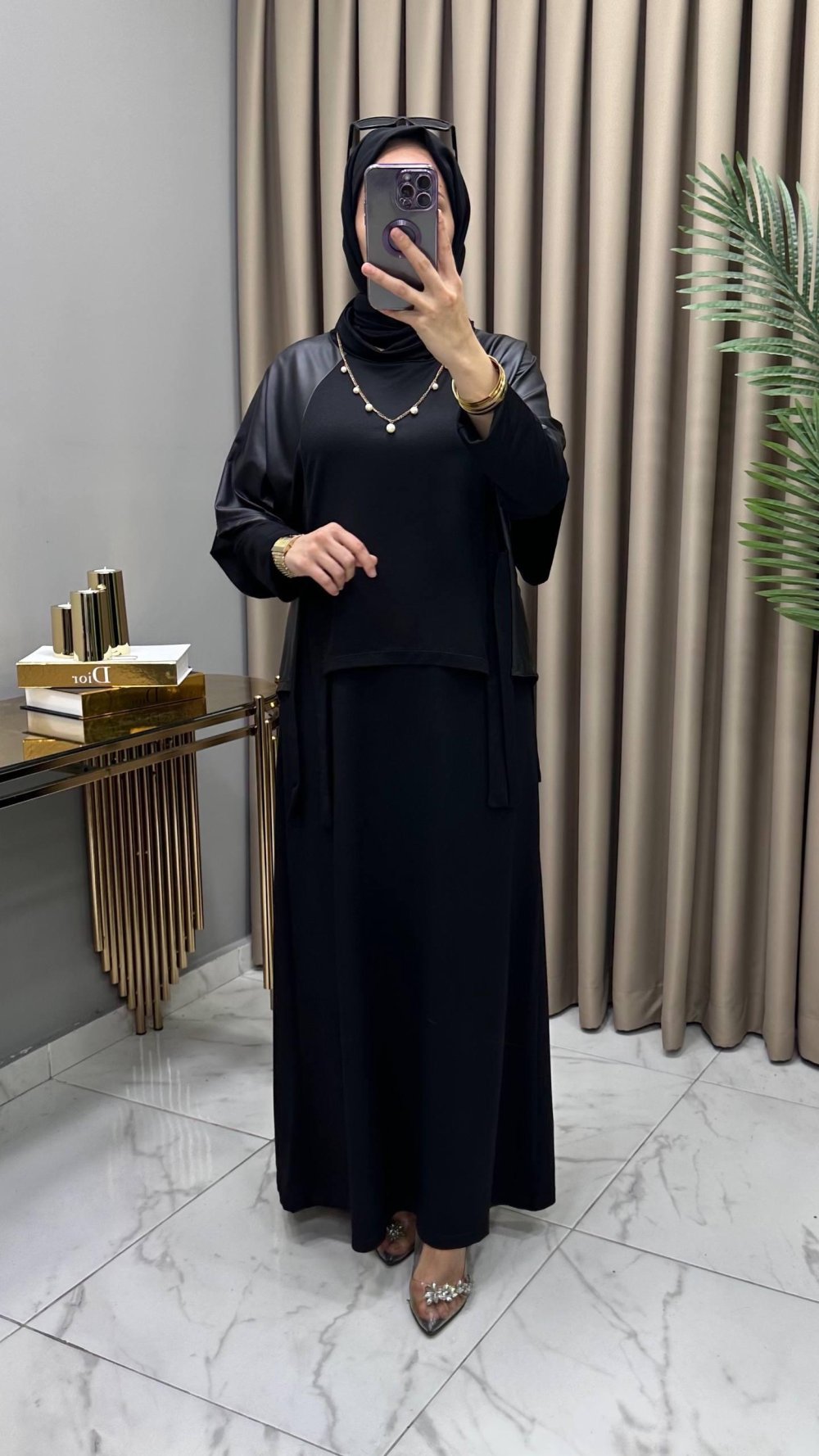 Deri Detaylı  Elbiseli Takım