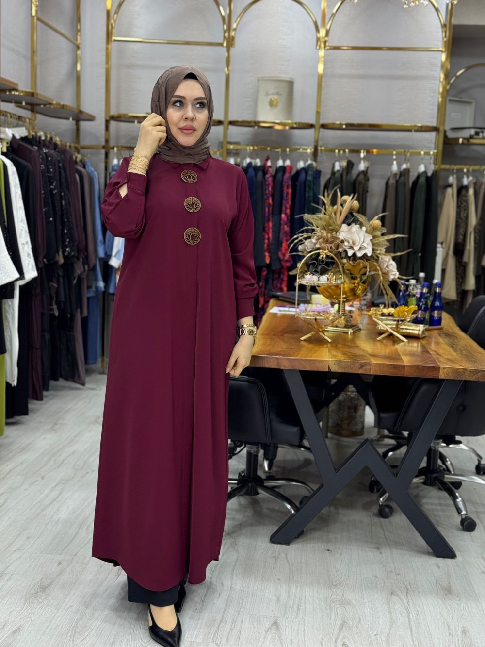 Kumaşı kreptir. Gizli düğmelidir.