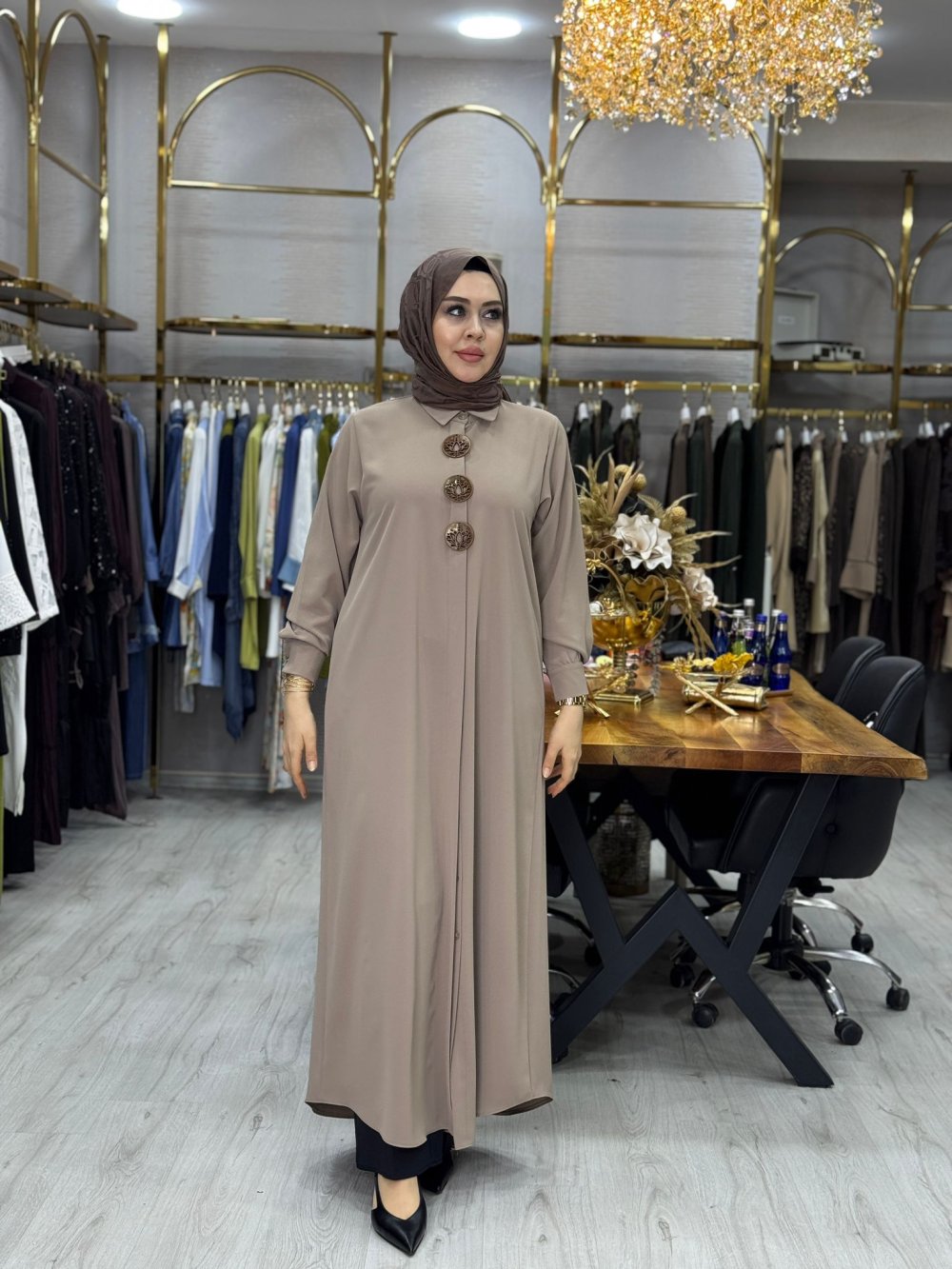 Kumaşı kreptir. Gizli düğmelidir.