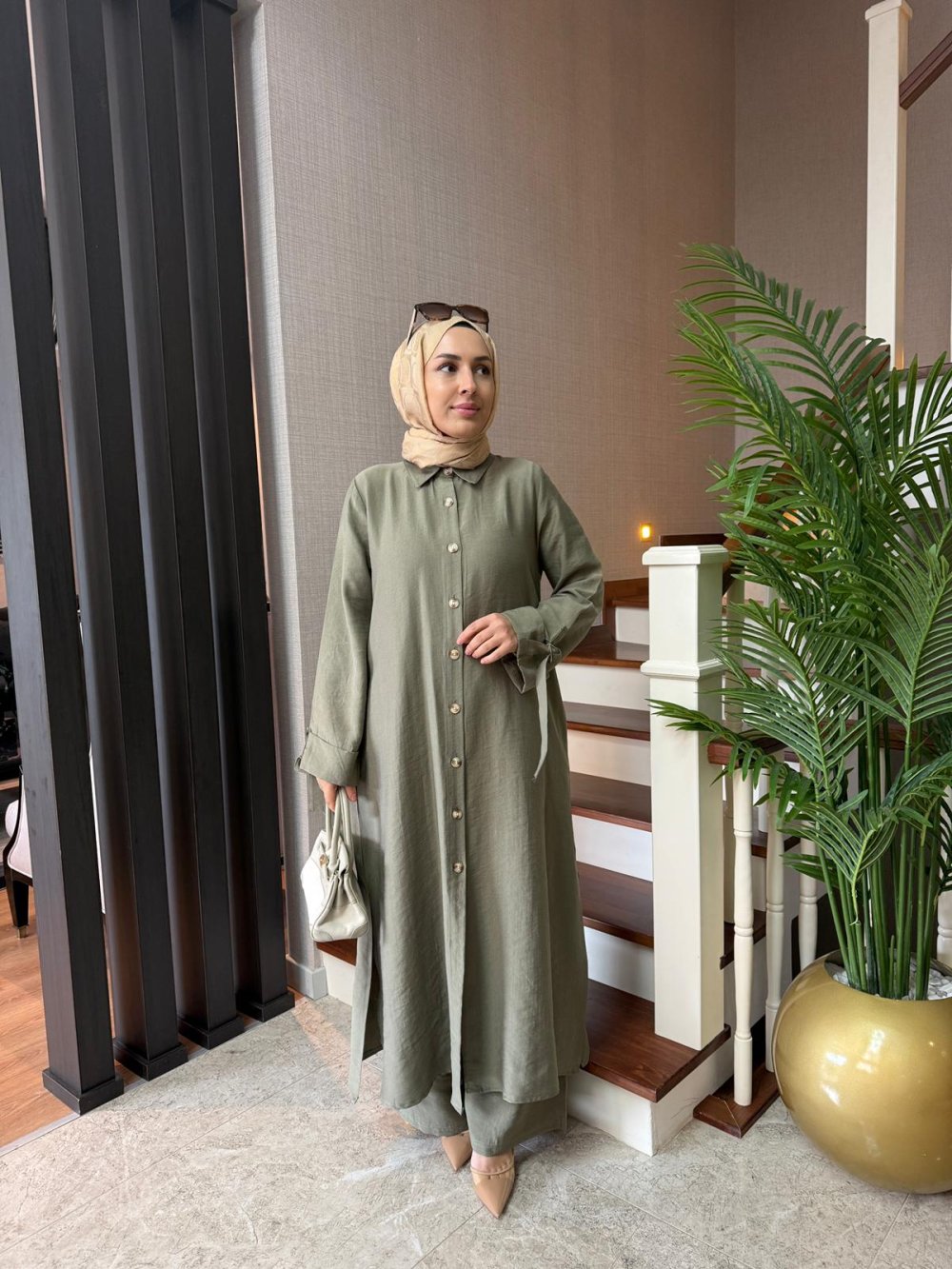 Tunik boy 125 cm’dir. Yanlarda cepleri mevcuttur. Kolları D toka apolet detaylıdır.