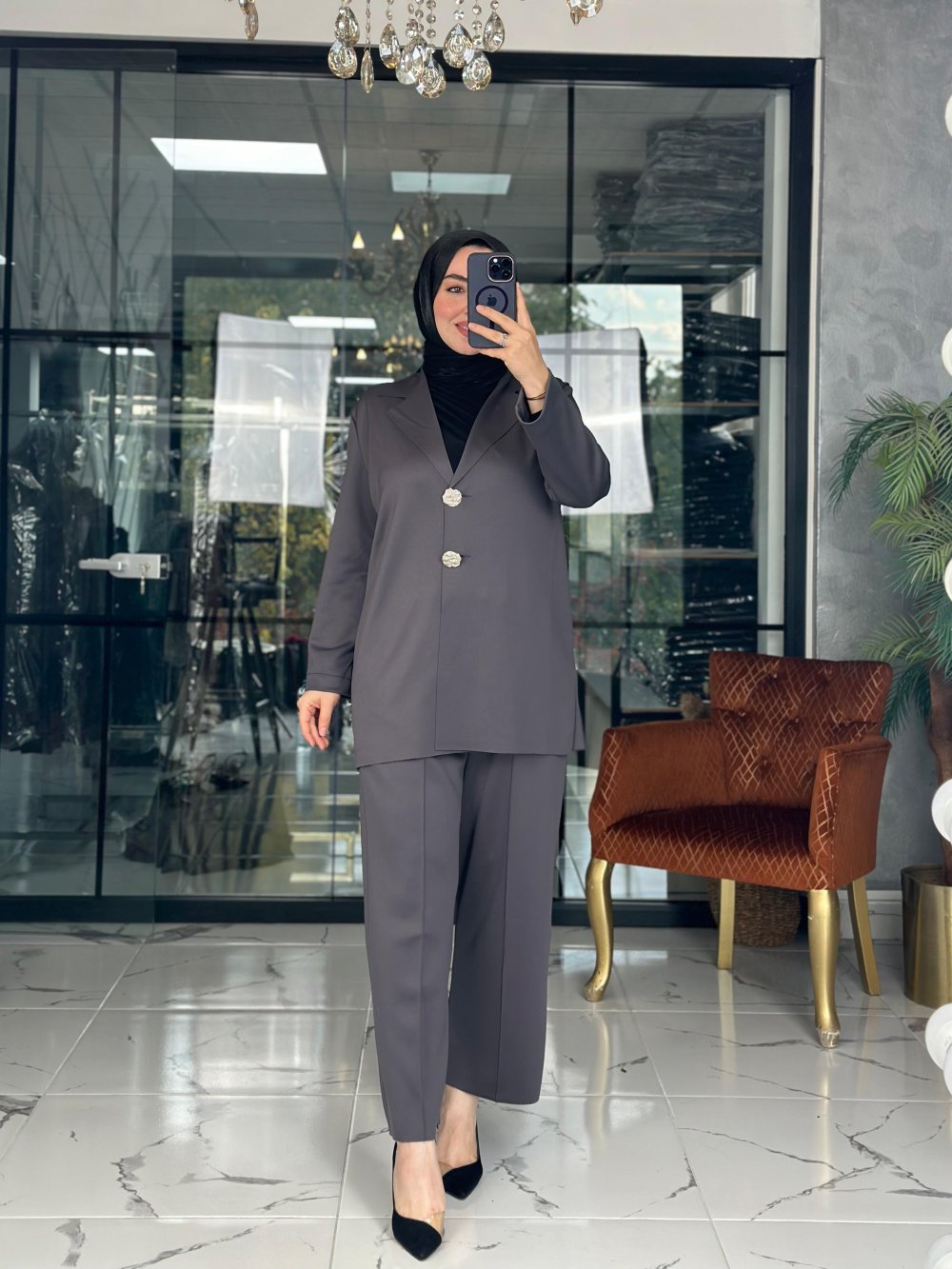 Kumaşı scuba kreptir. Önü düğmelidir. Pantolon beli lastiklidir. Rahat kalıptır.