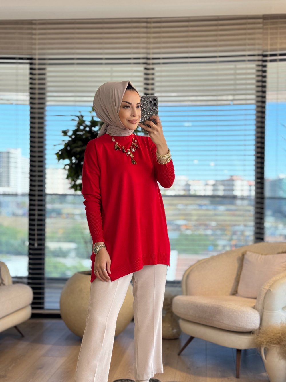 MRW1503 Basic Düğme Triko Tunik Kırmızı
