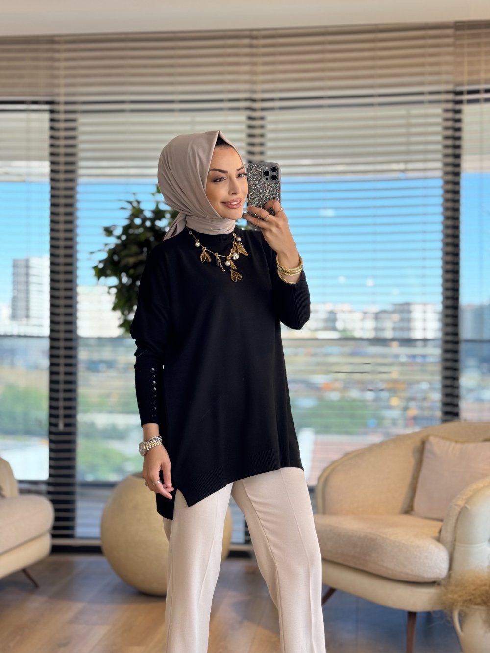MRW1503 Basic Düğme Triko Tunik Siyah