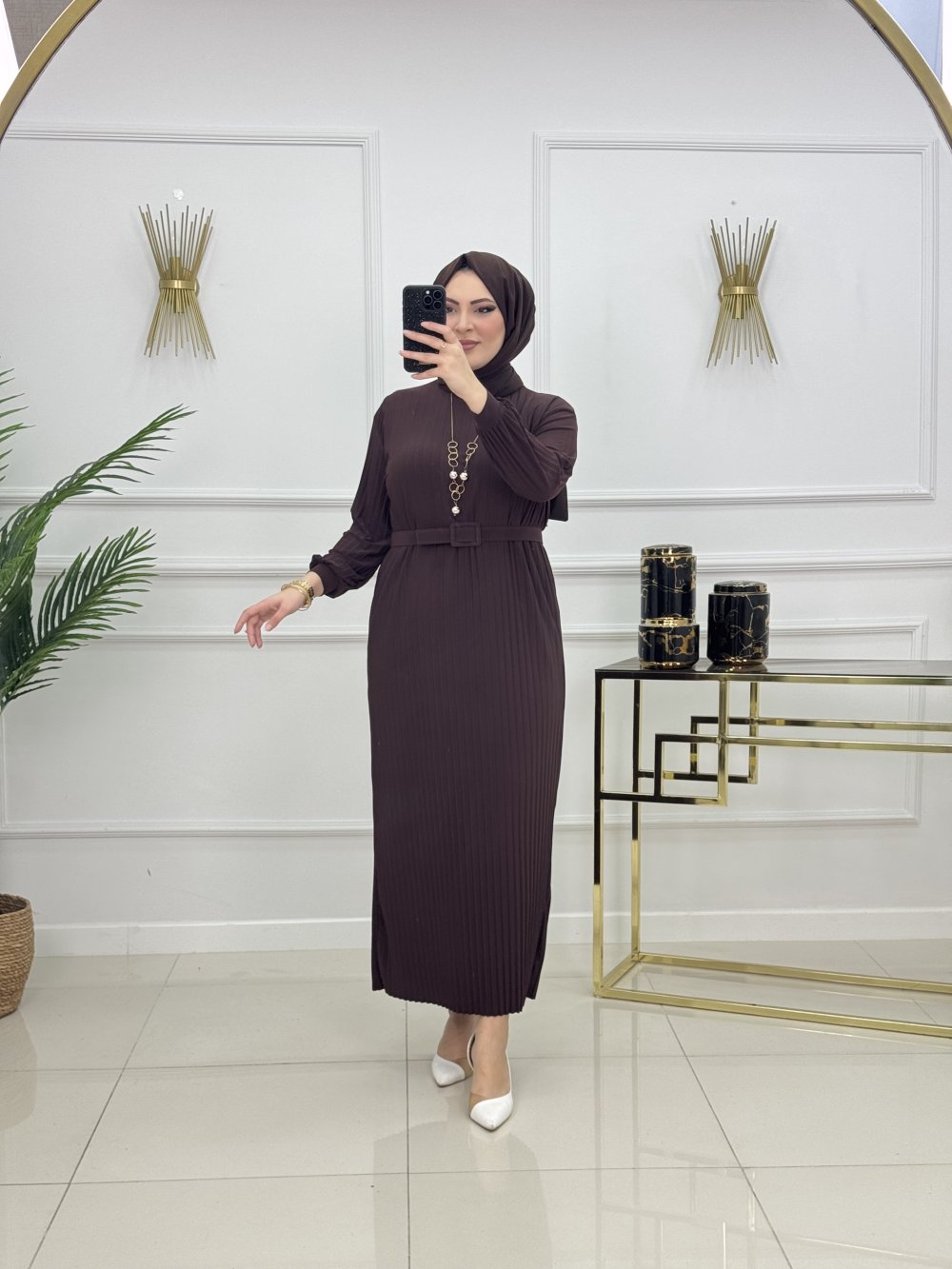 NAZLI PİLİSELİ ELBİSE-ACI KAHVE