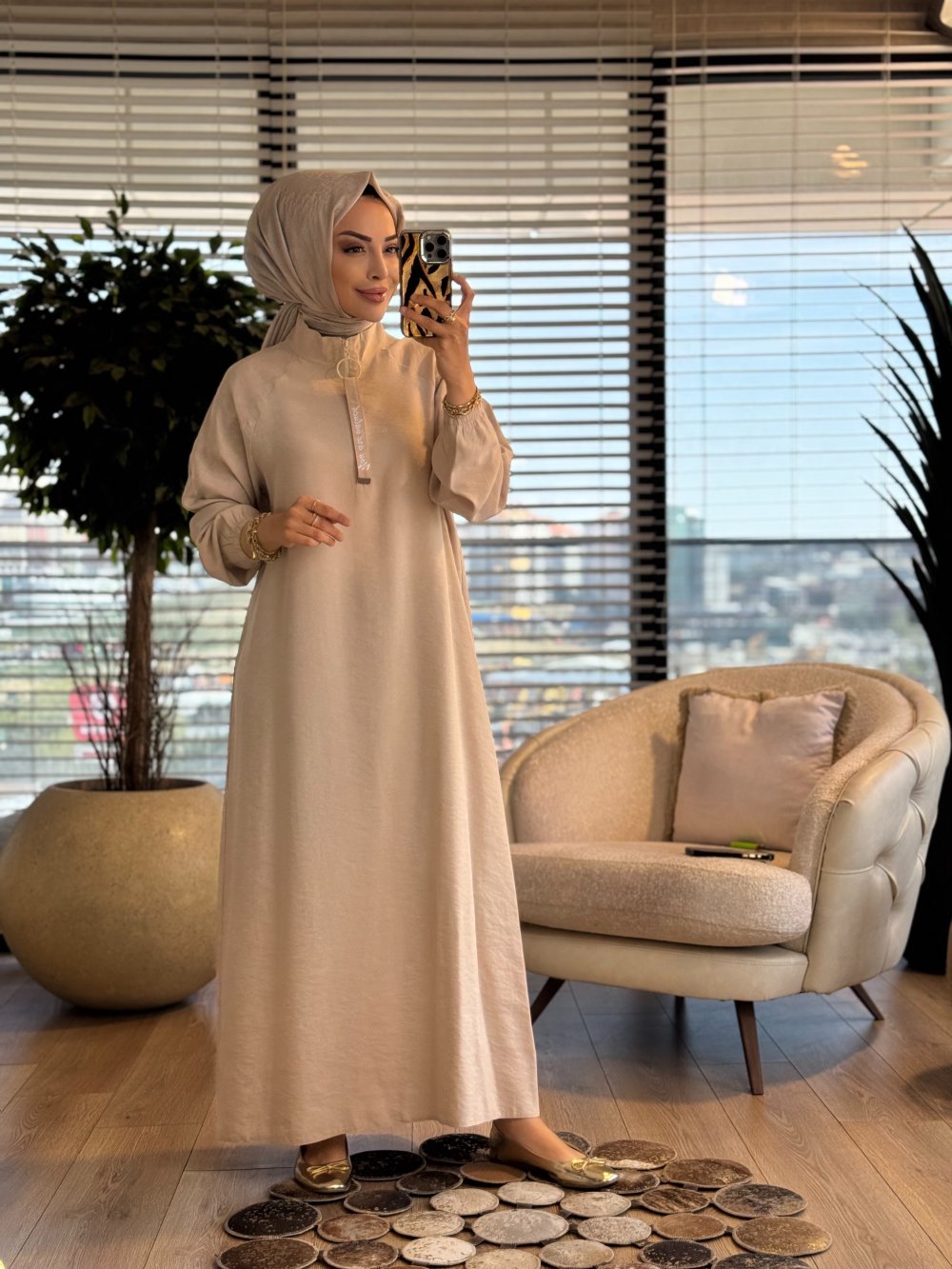 S5935 Dik Yaka Ferah Elbise Bej