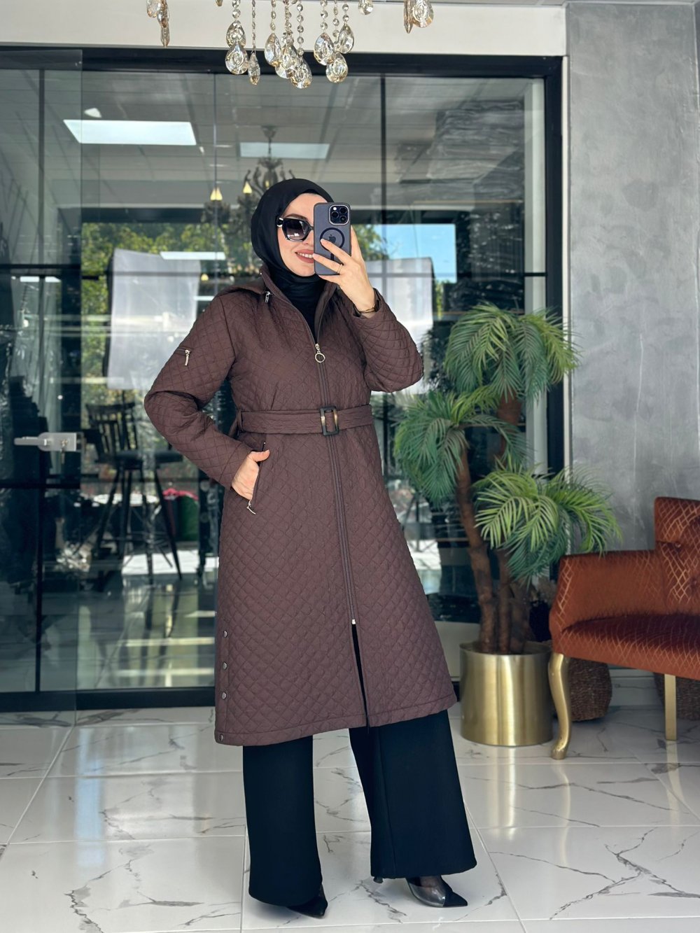 Kumaşı kapitonedir. Şapkası çıkabilir. Cepleri fermuarlıdır. Seyyar kemerlidir.