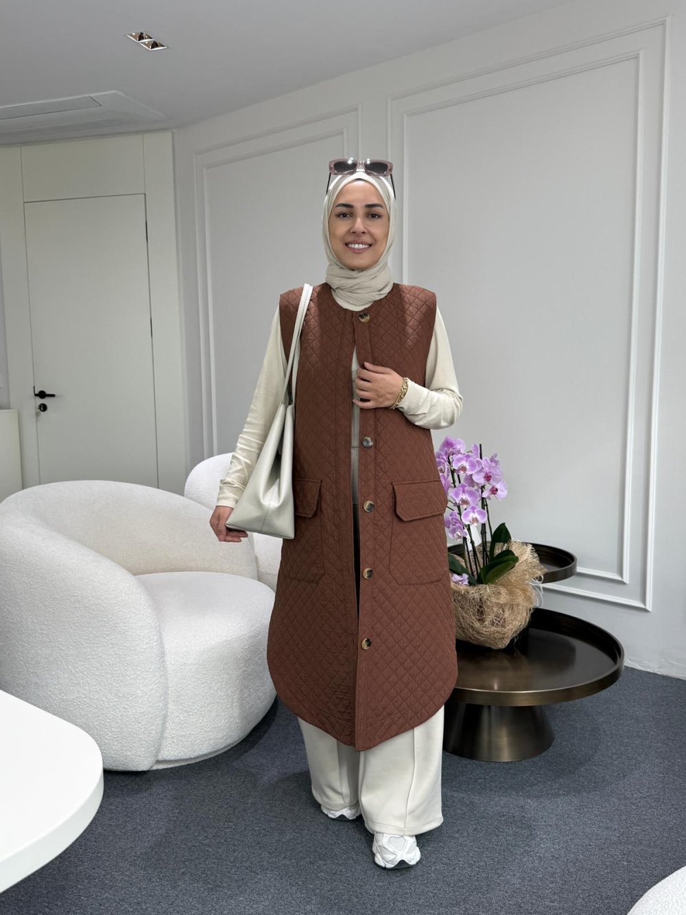 Uzun Kapitone Yelek Kahverengi